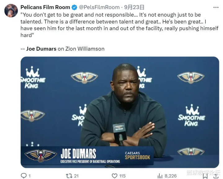 最后说说锡安的问题,乔-杜马斯在媒体日上公开敲打他:“光有天赋是不够的,你不能只想要伟大,而不想承担责任。我们一直在强调这一点,要为自己所做的事情负责,要敢于担当。”杜马斯可不会惯着锡安,如果不自律就送走他。