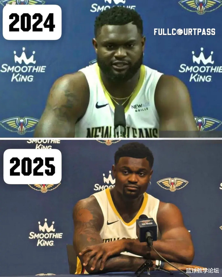 可能有球迷觉得,这看起来也不瘦啊?对比一下去年媒体日的照片,锡安明显减重了。队友特雷-墨菲今天接受采访时说:“锡安比以往夏天都要瘦,他的精神状态也非常好。”鹈鹕总经理乔-杜马斯表示,最近一个月,锡安训练非常凶。