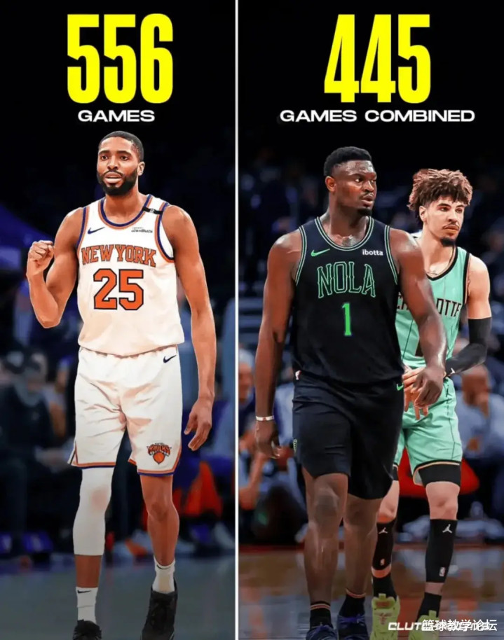 锡安的合同是5年1.93亿美元,2028年夏天到期。不过,他最后两年的合同是无保障,锡安必须达到出战场次标准,才能转为保障合同。一组很尴尬的数据对比:锡安和三球生涯至今,加起来打了445场;大桥一个人打了556场!