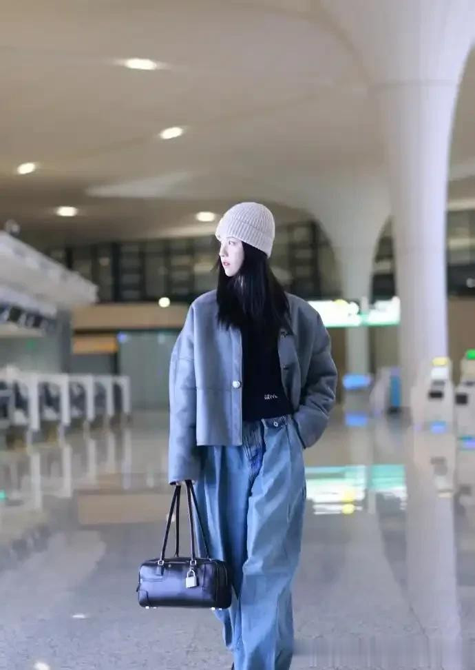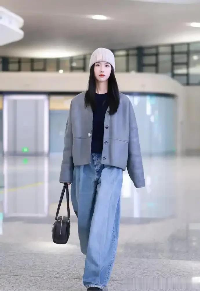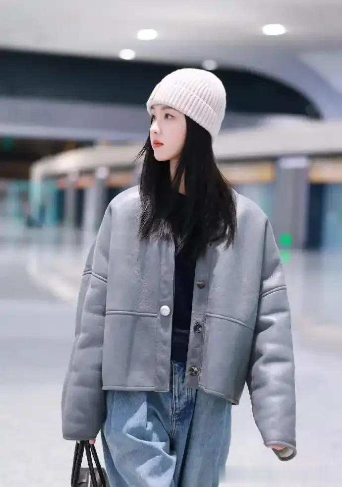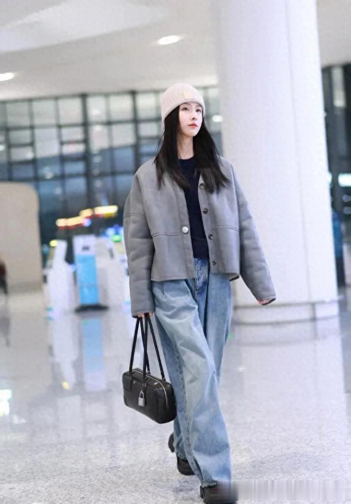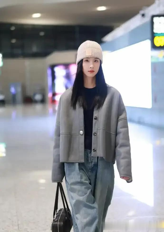 陈都灵淡妆也惊艳, 灰色毛绒外套搭直筒牛仔裤, 干净气质扑面而来
