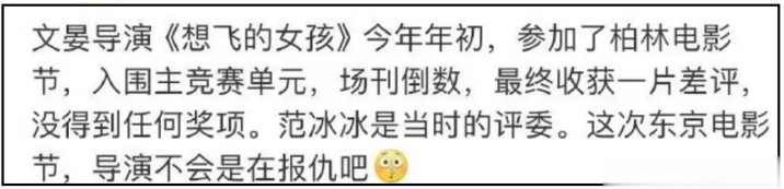 有人扒出,文晏此前导演作品《想飞的女孩》入围柏林电影节,但却差评一片。而当时范某是评审之一,网友猜测或许是因为这个原因,才让她做出针对举动。