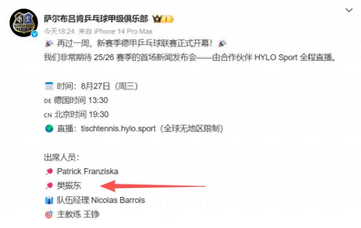 北京时间8月24日,德甲萨尔布吕肯乒乓球俱乐部在社交媒体上正式宣布,将于8月27日(周三)德国时间13:30(北京时间19:30)为新赛季举行首次新闻发布会,这场由合作伙伴HYLO Sport全程直播的发布会,因为一位特别人物的出席而引发全球关注,他就是奥运冠军、中国乒乓球名将樊振东