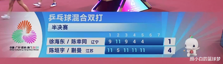 全运会混双半决赛,陈垣宇/蒯曼4-1击败徐海东/陈幸同挺进决赛,五局比分:11-9、5-11、11-9、11-4、11-4,总的来说陈垣宇/蒯曼赢得较为轻松,换言之陈幸同单日双线折戟。