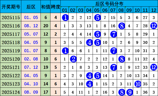 上期后区开出:08 09。和值为17,较上一期上升;跨度为1,较上一期下降。本期预测和值下降,推荐和值9;跨度不变,推荐跨度为1。本期后区推荐:04 05。