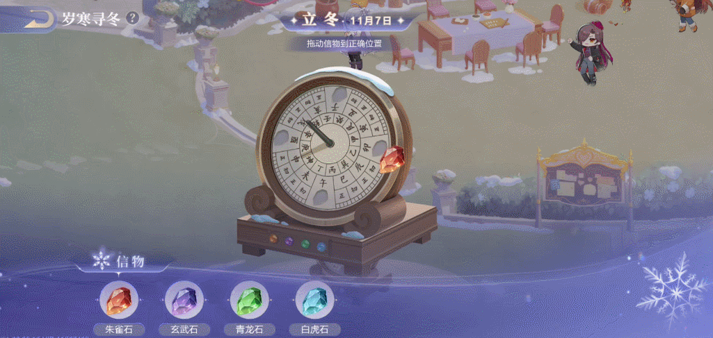 ③车手们收集完成节气信物即可在图鉴领取到进度奖励-冬雪币,收集到全部节气信物还可以完成节气小游戏兑换节气明信片领取到更多冬雪币奖励~在这里,车手们也可以看到四个信物需要放置到日晷的合适位置,恰好对应了东、西、南、北四个方位~具体位置小橘子也为车手们整理出来啦!