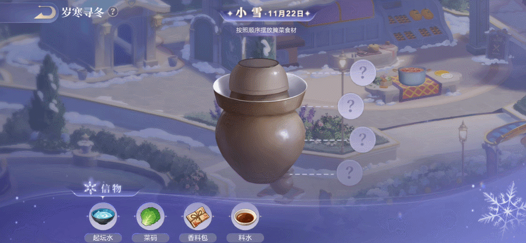 ①在传统的习俗中有着小雪时节腌酸菜的习俗,在饱含传统文化的梦幻庄园冬日主题活动中,当然也有着这样的小游戏啦!车手们可以前往活动页面-图鉴查看腌菜缸所需要的信物:起坛水、菜码、香料包、料水